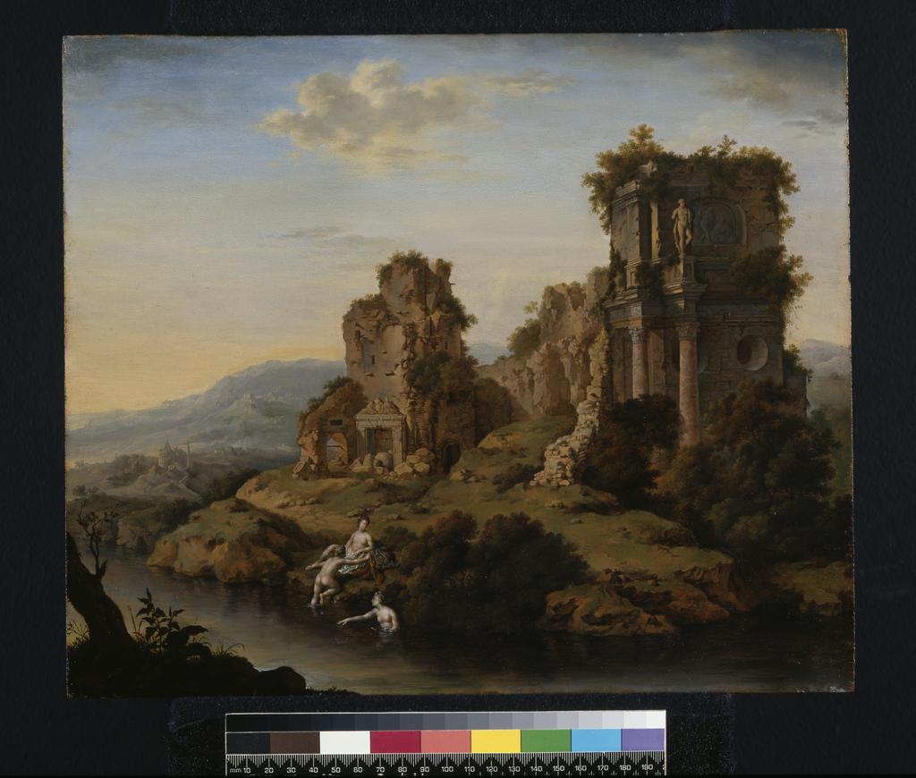 Landscape with ruins, nymphs bathing. Mieris, Willem van (Dutch, 1662-1747). Oil on panel, height 30.2 cm, width 35.9 cm, circa 1730.