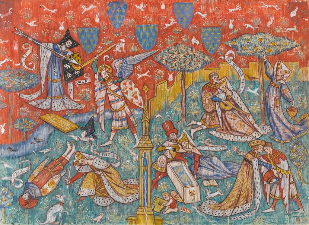 Design for the Tapestry Curtain for 'Saint Joan', by George Bernard Shaw. Ricketts, Charles de Sousy (British, 1866-1931). Watercolour and bodycolour with pen, black and red ink over graphite on paper, height 344 mm, width 492 mm, circa 1923. Given by the National Art Collections Fund, 1933.